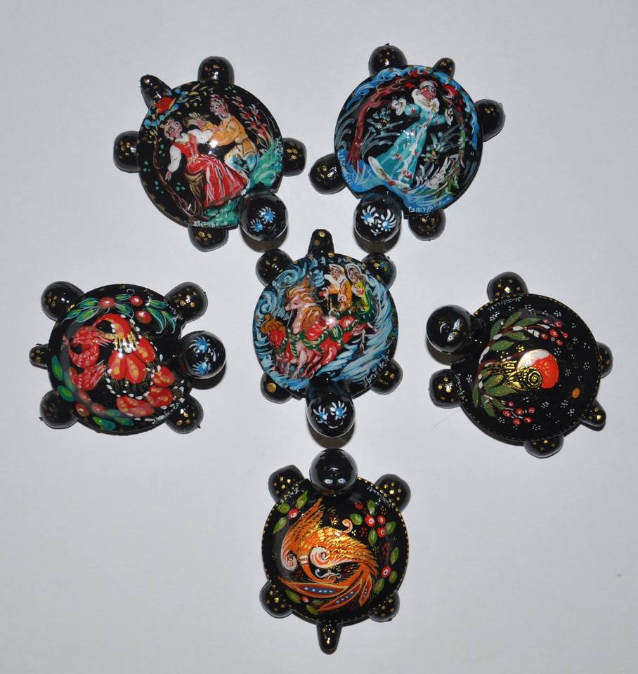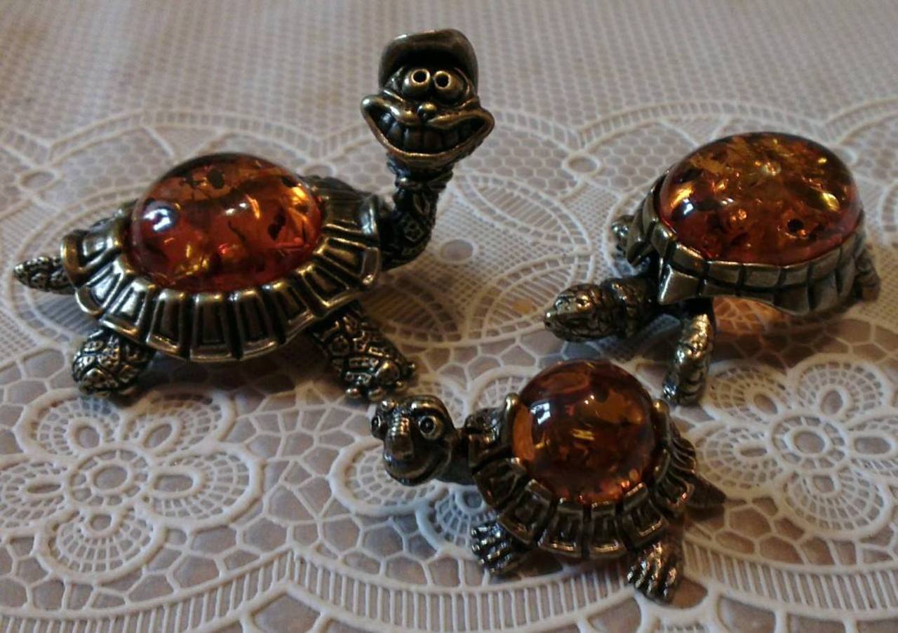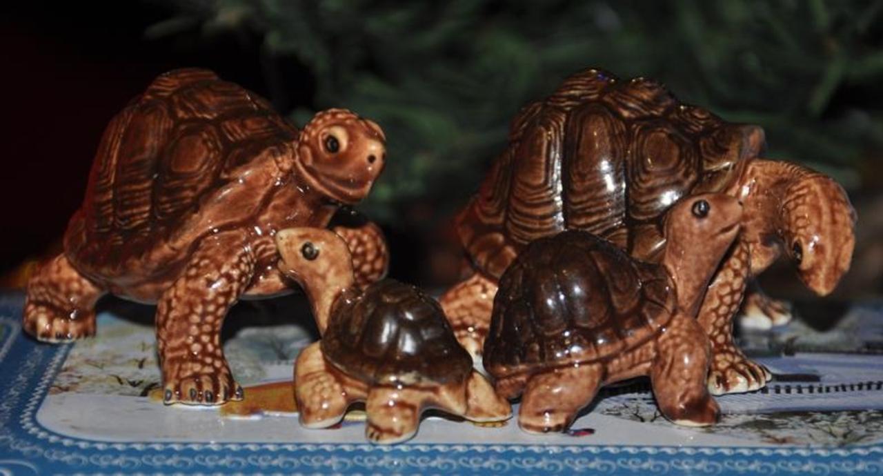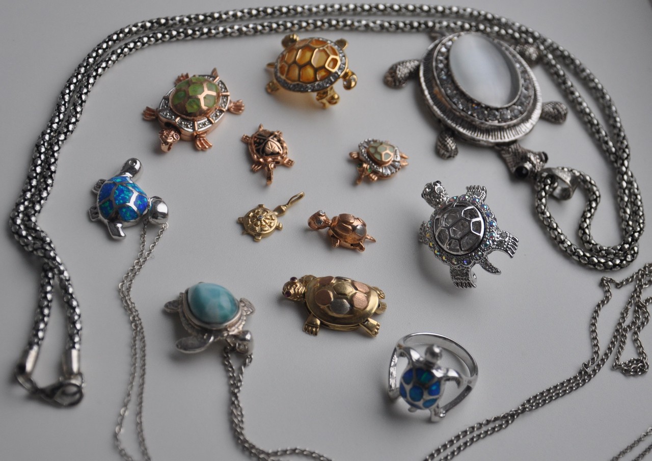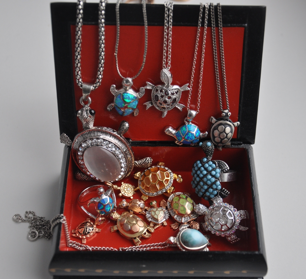 Около 100 фигурок черепах выполнены из минералов - селенит, агат, лазурит, снежный обсидан (слезы апачей), коралл, яшма, халцедон, малахит, авантюрин, жадеит, оникс, горный хрусталь, розовый кварц, дымчатый кварц, белый кварц, сердолик, бычий глаз, мыльный камень, нефрит, янтарь.